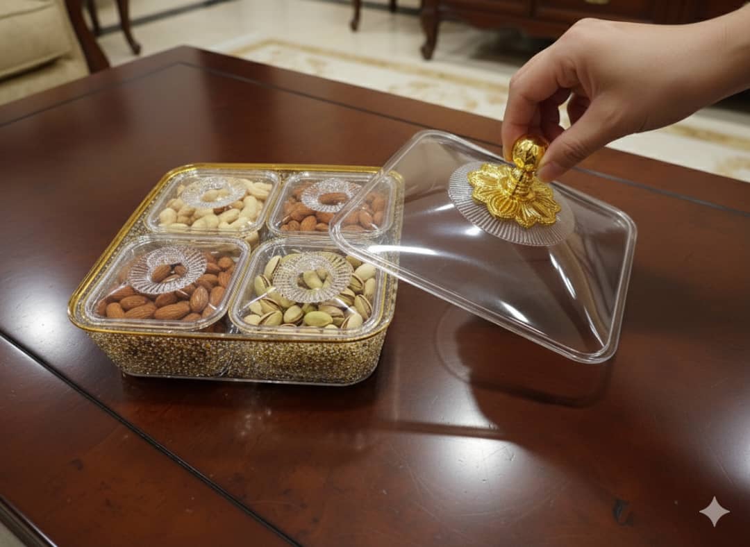 طقم صحن تقديم حلويات اكرليك شفاف منقط ذهبي مع 4مطايب باغطية