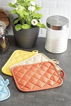 طقم عملي وأنيق من ماركة جافي، يحتوي على قطعتين من مواقف (مْوَقِف) قماش مربّع بشكل حراري ملون، مصممة لحماية الأسطح من الحَرارة العالية أثناء استخدام الأواني الساخنة أو تحريك القدور