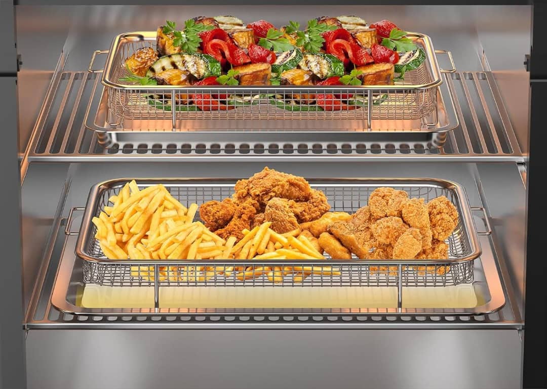 يسمح تصميم السلة الشبكية بتوزيع مثالي للهواء حول الطعام، مما يضمن الحصول على نتائج مقرمشة ومتساوية دون الحاجة لتقليب الطعام.