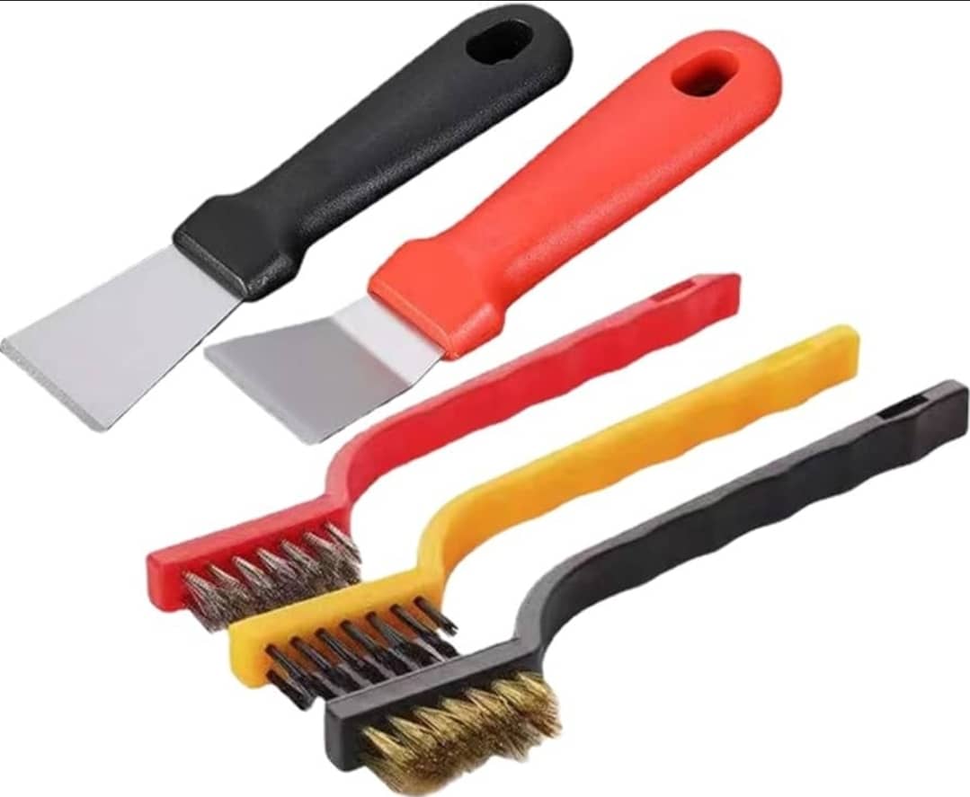- تتضمن المجموعة عادةً ثلاثة أنواع من الفرش: نحاسية، وفولاذية، ونايلون، بالإضافة إلى مكشطين.