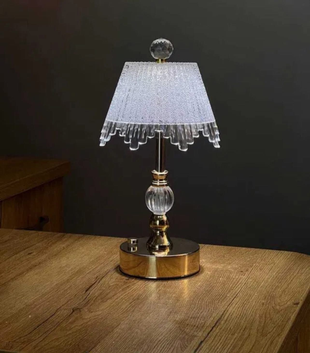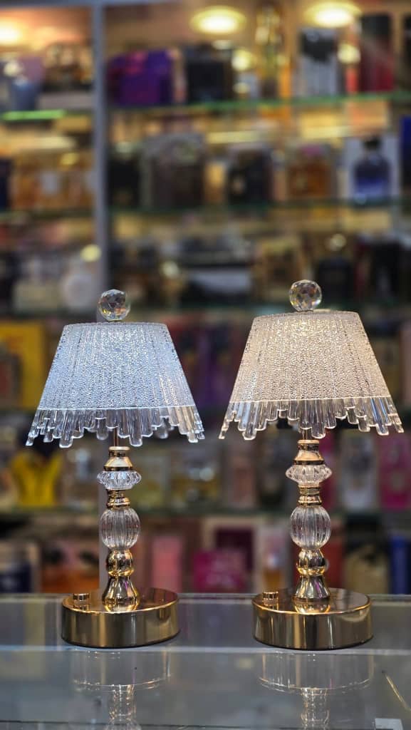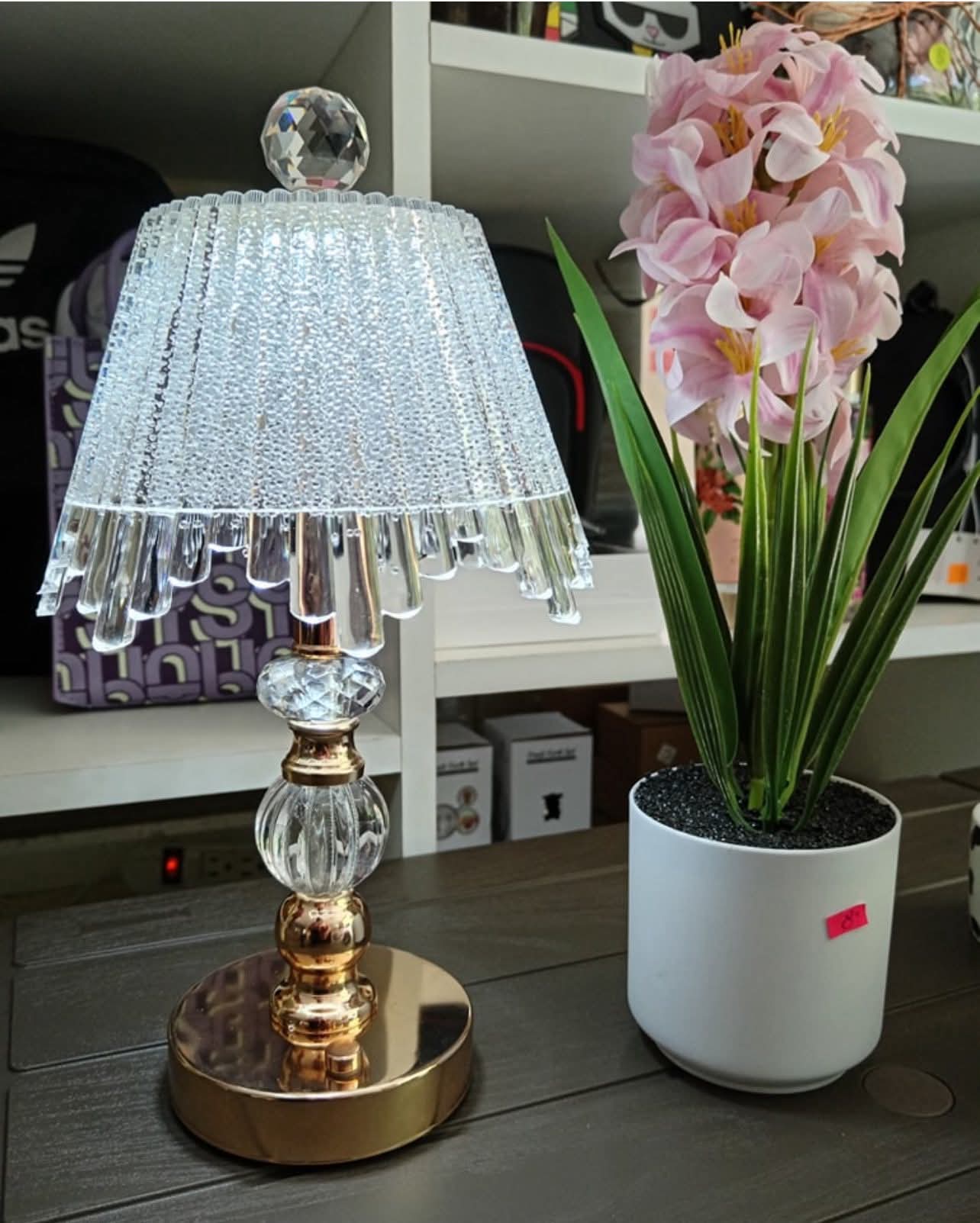 أبجورة أنيقة تضفي لمسة فاخرة على أي مكان، مصنوعة من كريستال شفاف فاخر بقاعدة ذهبية راقية لامعة تزيد من جمال التصميم. تعمل بالشحن لتوفير سهولة الاستخدام دون الحاجة لأسلاك، مع إضاءة ناعمة ومريحة للعين تضفي أجواء دافئة وهادئة في الغرفة. مثالية لغرف النوم، المكاتب أو ديكور الصالون العصري.