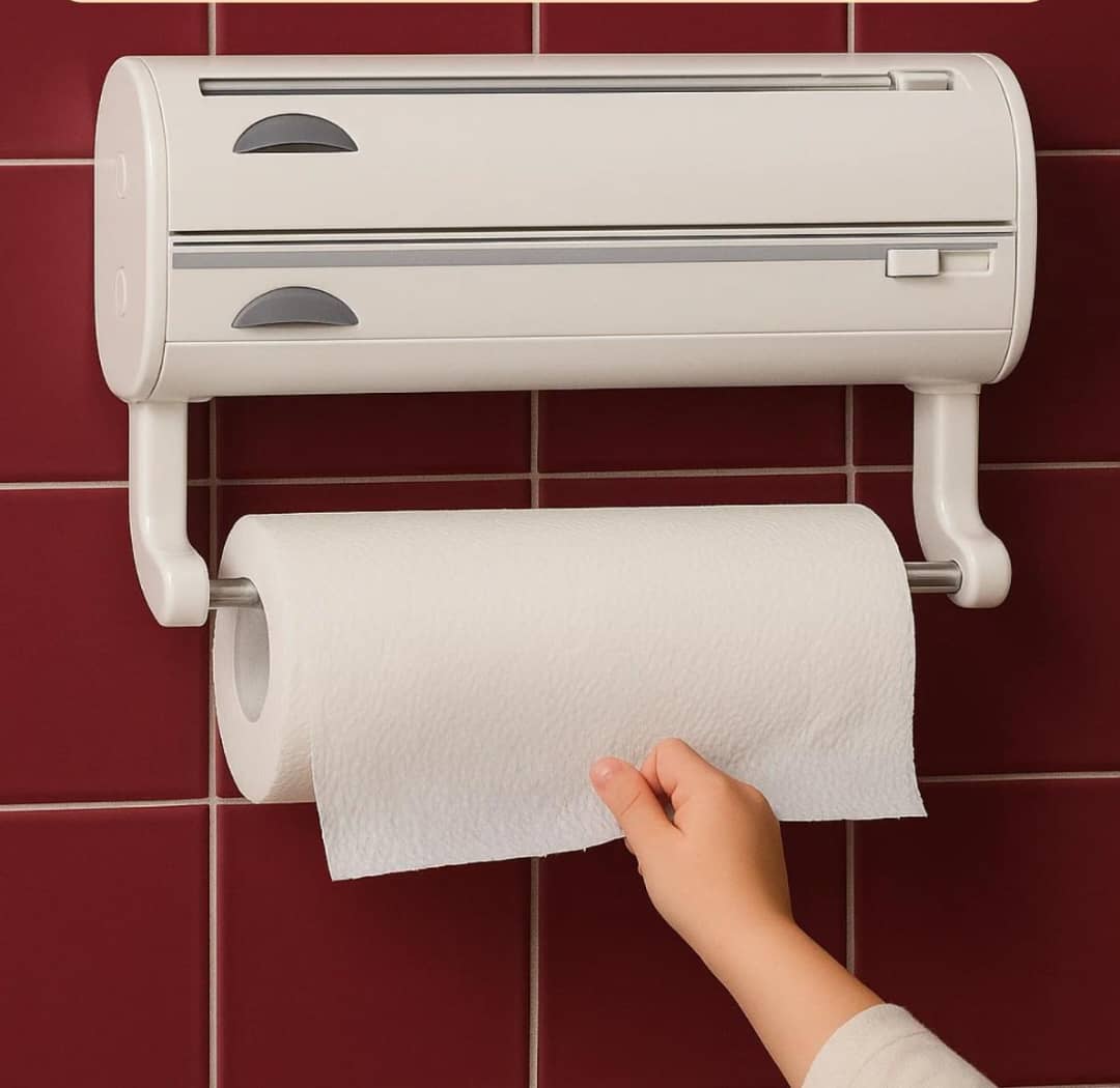 حامل ثلاثي لورق القصدير والمناديل والنايلون ضروري في جميع المطابخ. إنه مثالي لتخزين ورق القصدير والمناديل ولفائف النايلون بسهولة. مصمم ليناسب جميع أحجام اللفائف، فلا تتردد في شراءة
