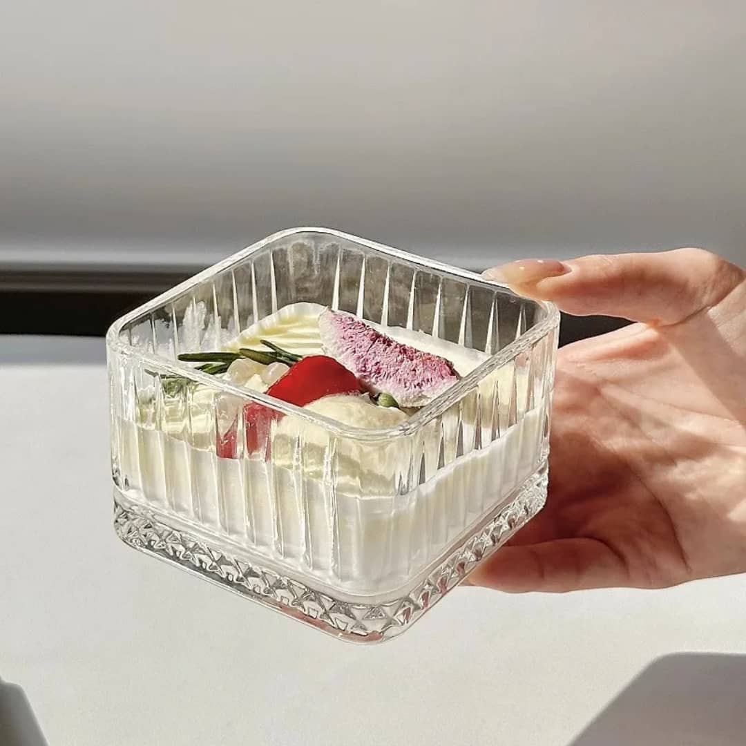 - مطيبة تقديم مربع من الزجاج الكريستالي بتصميم مضلع أنيق ونقش زخرفي في الأسفل، مثالي لتقديم الحلويات الخفيفة بأناقة.