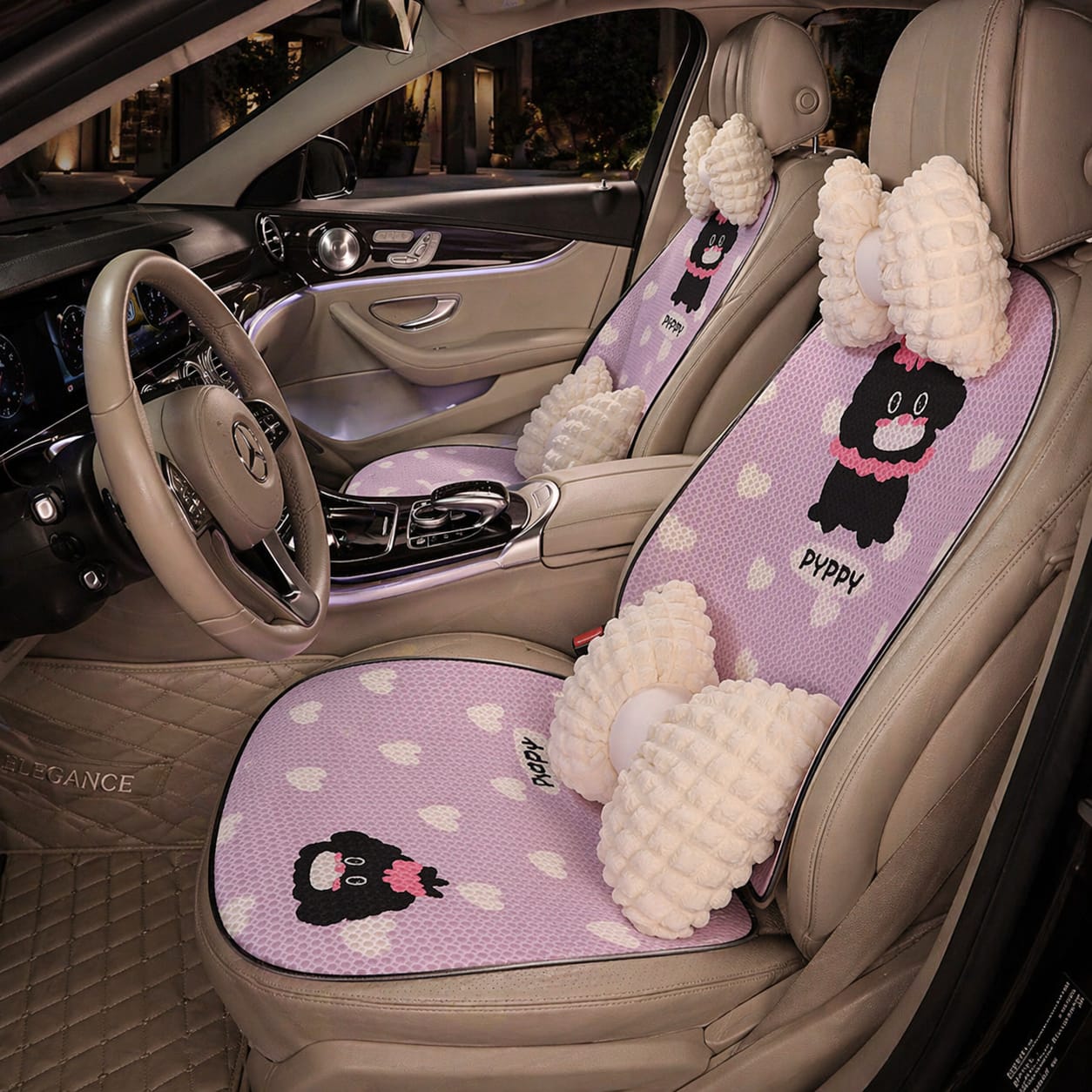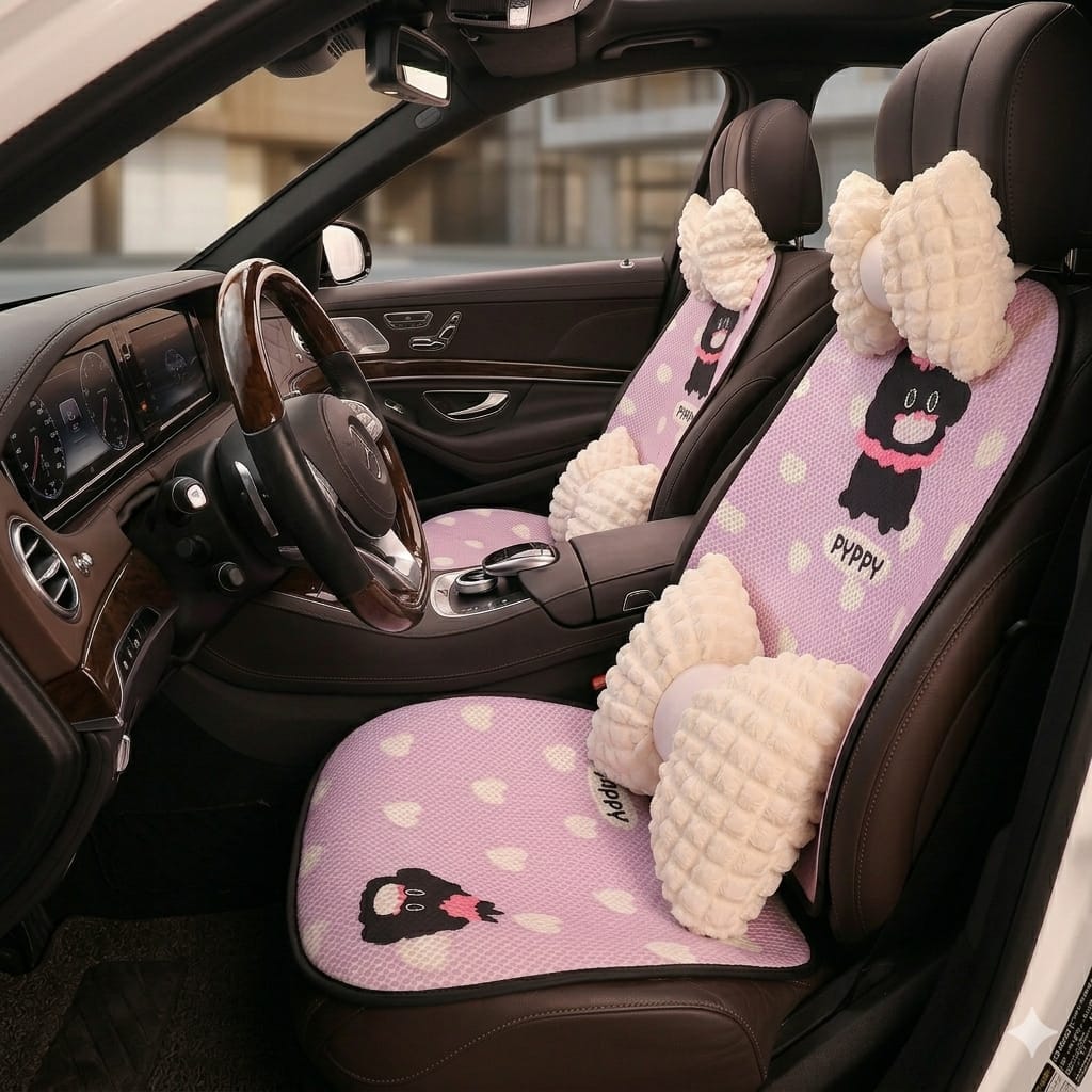 يتضمن الطقم مسند رأس و وسادة دعم قطني (مسند ظهر) بتصميم "فيونكة" (Bow) كبيرة محشوة لتوفر لكِ دعماً ممتازاً للرقبة والظهر أثناء القيادة لمسافات طويلة.