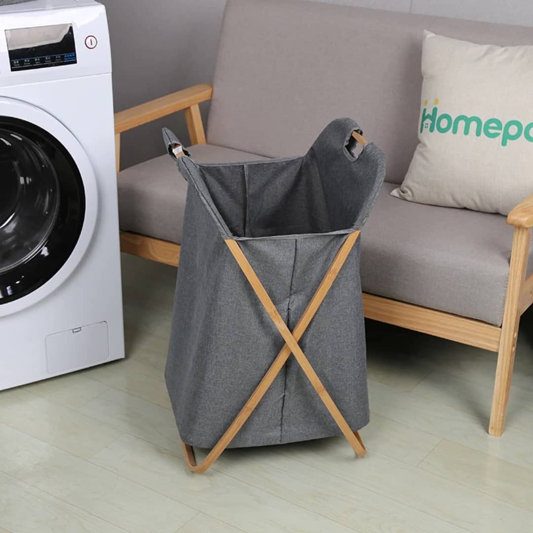 سلة ملابس قماش ستاند خشب قابلة للطي ذات تصميم عصري.